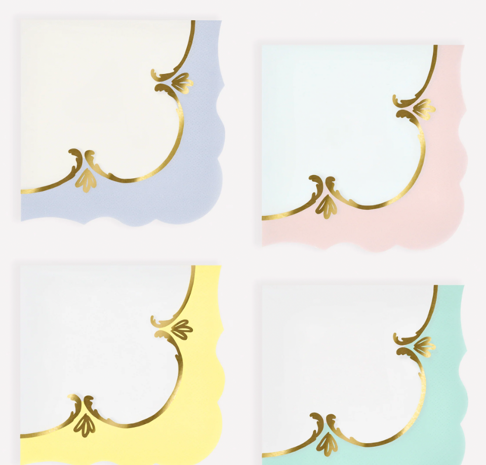 Inspired by the ornate elegance of rococo design, these small napkins come in a harmonious mix of pastel blue, pink, yellow and green. Made from soft paper, with a stylish wavy edge and shiny gold foil illustrated details, they add a refined flourish to any table setting. Perfect for spring gatherings, garden lunches, high teas, cocktail parties or bridal showers, they'll bring a beautifully coordinated, elevated touch to joyful, grown-up celebrations.