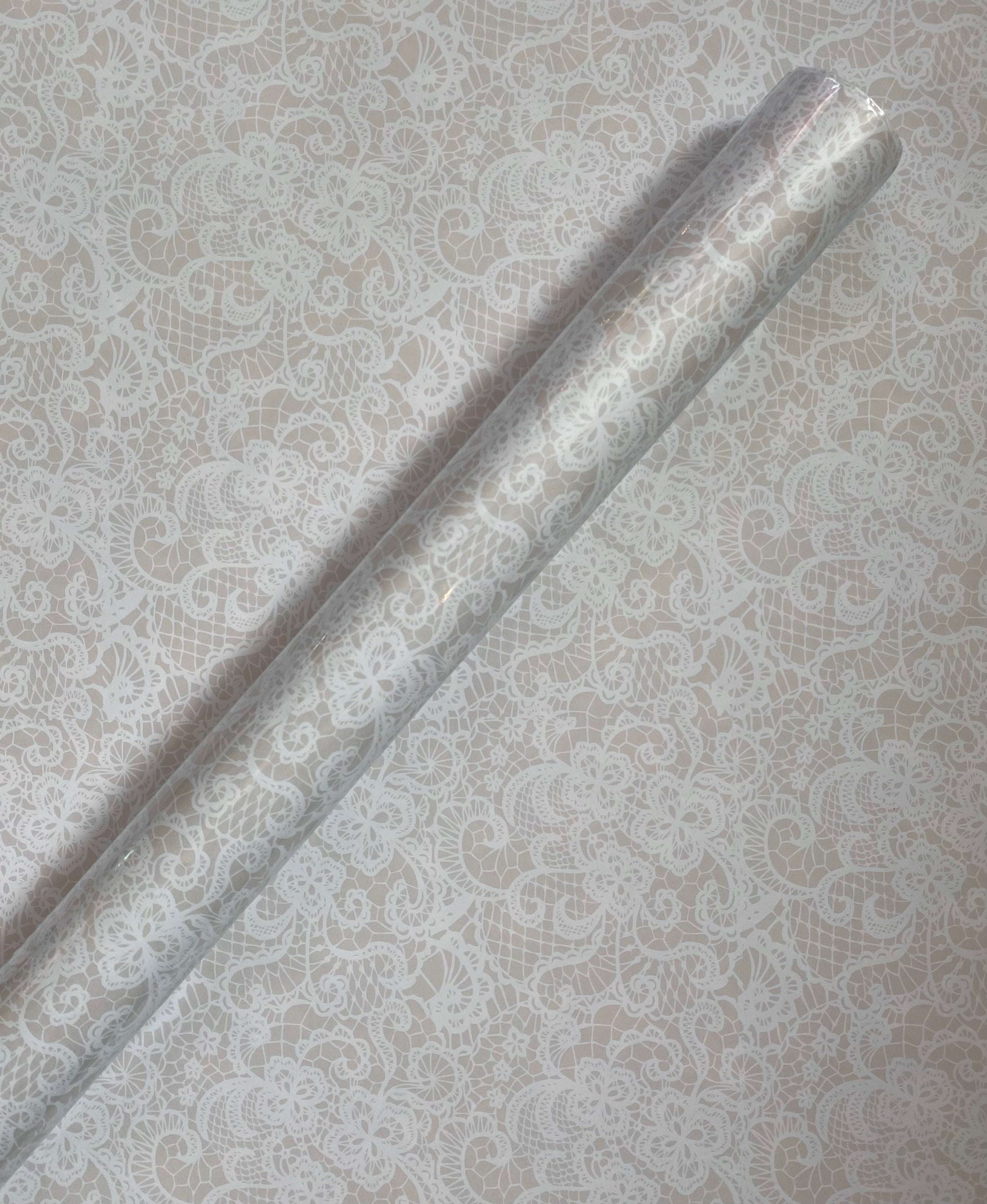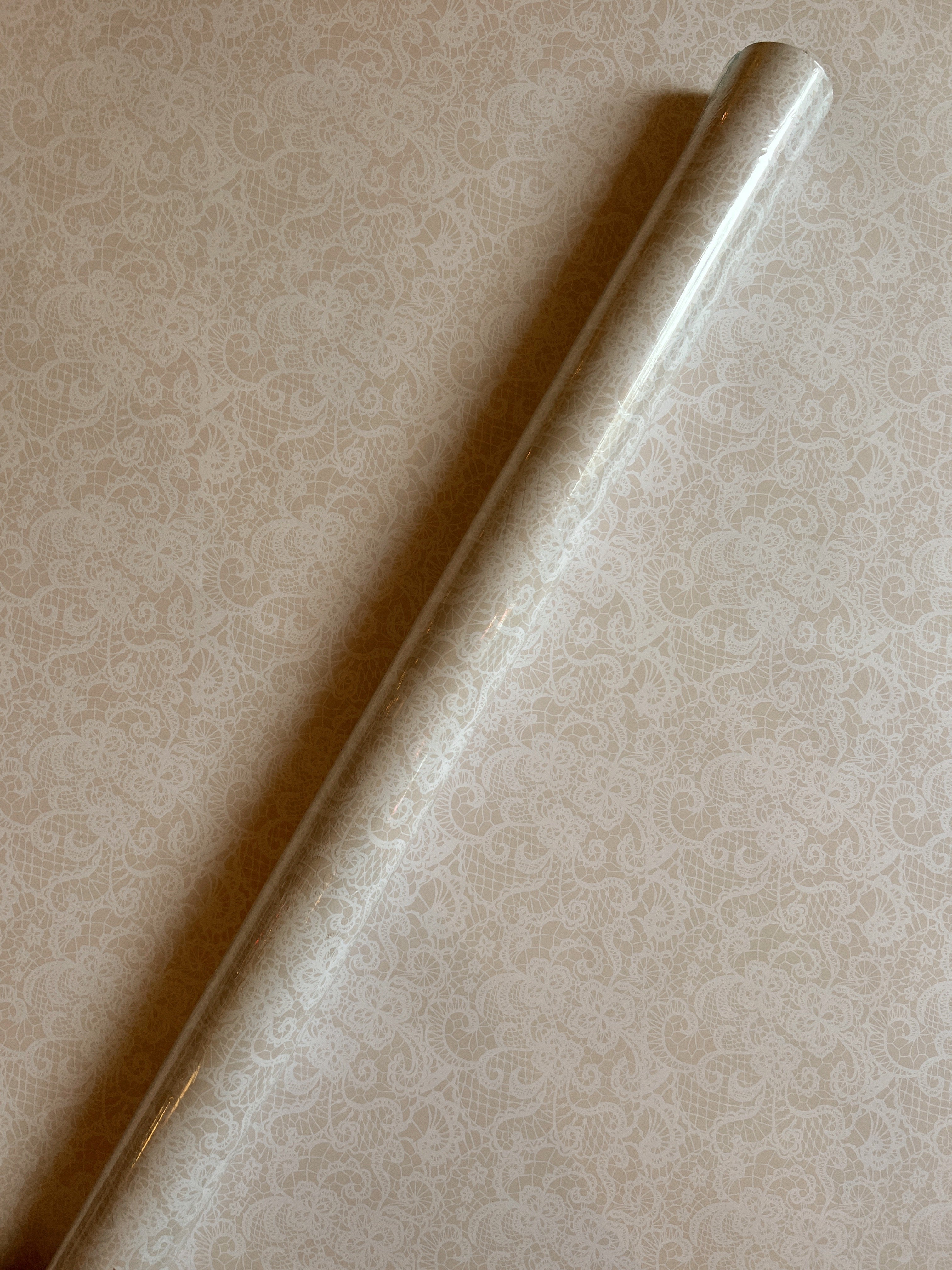A delicate white lace on a soft taupe background brings some understated elegance to gift wrapping. We love pairing this clean design with layers and layers of our favorite luxe ribbons and tags!