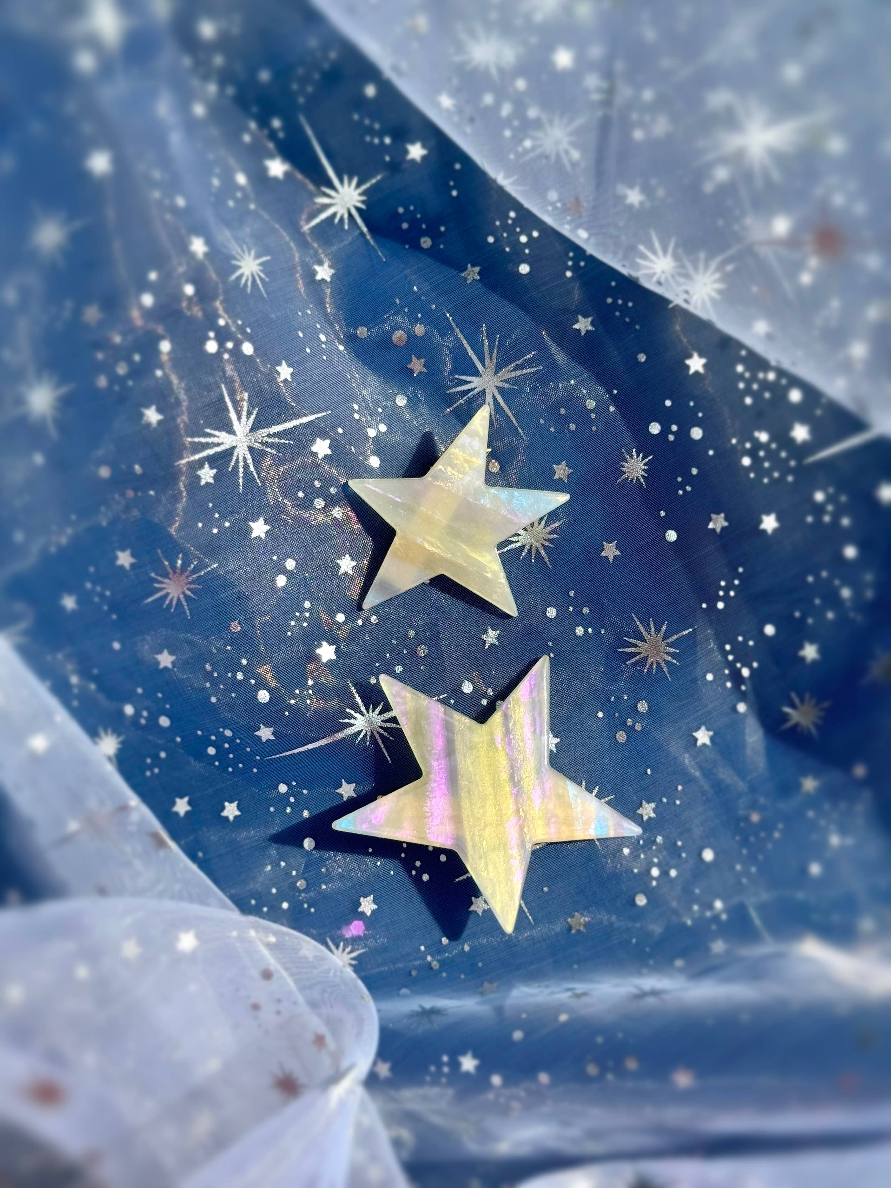 These beautiful iridescent star clips are the perfect statement for the holidays! ⭐️ Made with bio-plastic, not petroleum! ⭐️ Complete with iridescent finish ⭐️ 2" and 3" long each. Come as a set. ⭐️ Strong hold with alligator style clip