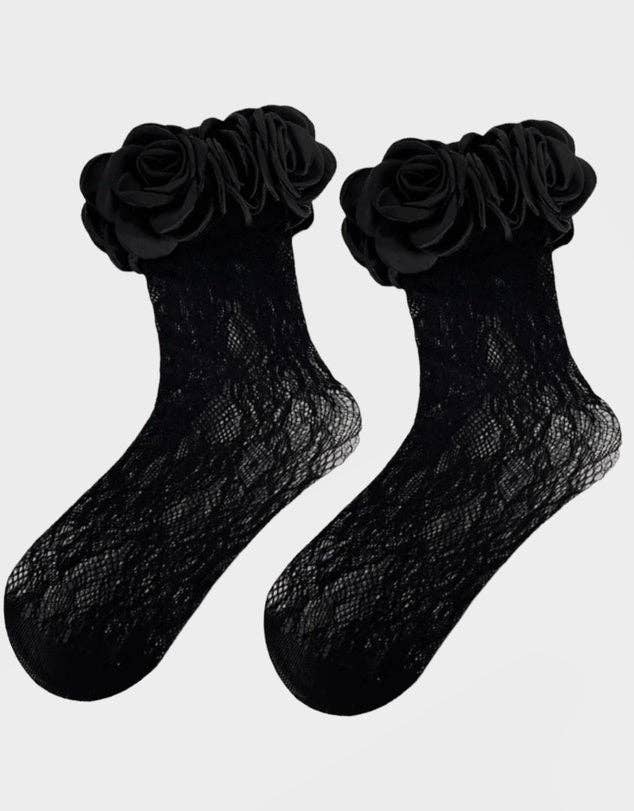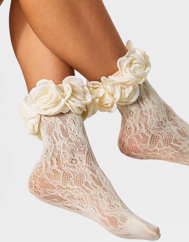 Lace rosette socks add some sweet flair to any shoe pairing. Elegant Italian lace fabrication adored with chunky floral applique trim. These statement socks are perfect for pairing with Mary Janes, heels or boots. Wear pulled up or scrunched with endless shoe pairing possibilities. - Stretch fit