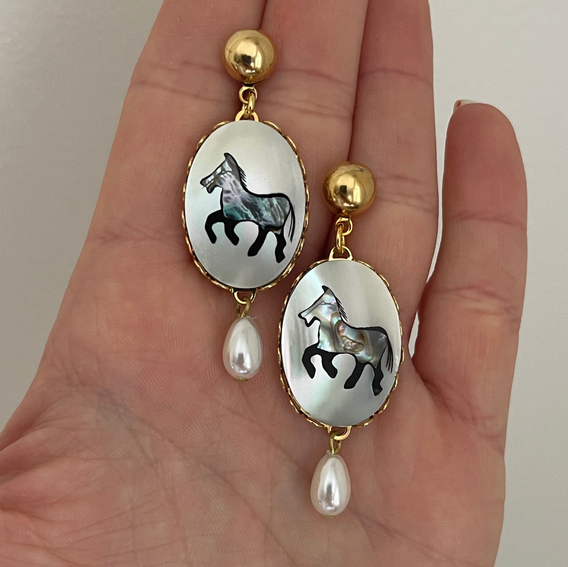 These incredibly special earrings are the perfect gift for any horse girl. Vintage mother of pearl cabochons in gold plated settings make for a truly memorable accessory that will be treasured for years to come.