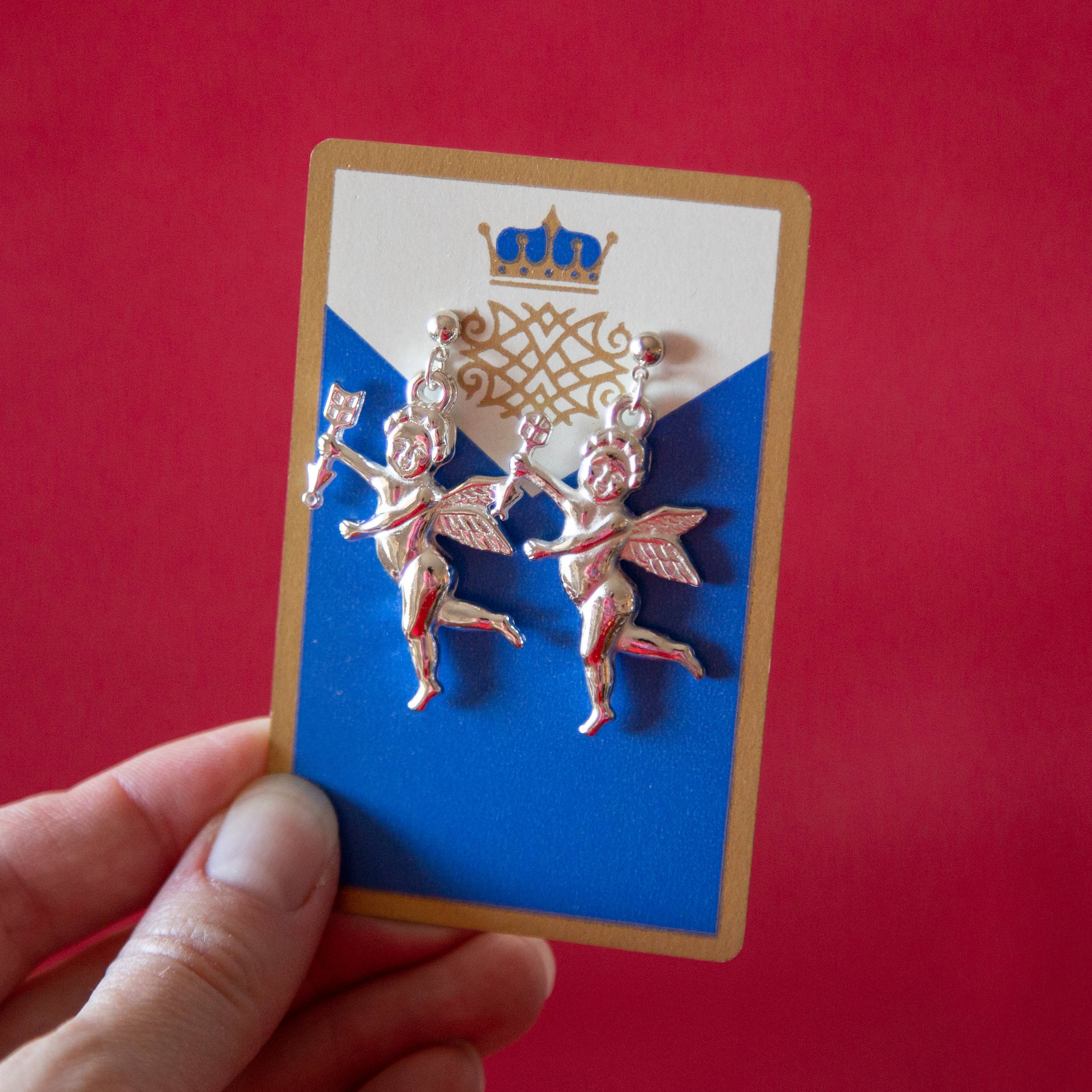 Deadstock vintage, lightweight & hollow large silver-plated plastic cherub / angel / cupid charms on sterling silver ear posts. All charms are secondhand & vintage to reduce our impact on the environment - some typical aging is to be expected but gives these pieces character. 1.5in charms